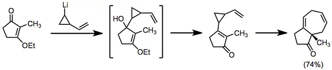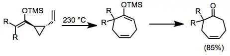 Do chladného (–78 °C) míchaného roztoku diisopropylamidu lithného (1,4–1,5 mmol/mmol ketonu) v suchém tetrahydrofuranu (4 ml/mmol zásady) v argonové atmosféře se pomalu přidává roztok n-butyl-trans-2-vinylcyklopropylketonu (1,19 mmol) v suchém tetrahydrofuranu (1 ml/mmol ketonu) a vzniklý roztok se míchá 45 minut při –78 °C. Poté se přidá roztok právě vysublimovaného terc-butyldimethylsilylchloridu (1,6 mmol/mmol ketonu) v suchém tetrahydrofuranu (1 ml/mmol chloridu) a suchý hexamethylfosforamid (0,5 mL/mmol ketonu). Následně se roztok míchá 15 minut při –78 °C a poté 2–3 hodiny za pokojové teploty. Následuje vytřepávání mezi nasyceným vodným roztokem hydrogenuhličitanu sodného (10 ml/mmol ketonu) a pentanem (20 mL/mmol ketonu). Vodná fáze se dvakrát promyje pentanem. Vzniklý extrakt se čtyřikrát promyje nasyceným vodným roztokem shydrogenuhličitanu sodného a dvakrát solankou, po čemž se vysuší pomocí pomocí síranu hořečnatého. Po odstranění rozpouštědla následuje destilace zbývajícího oleje, čímž vzniká příslušný silylenolether v podobě bezbarvého oleje. Poté se provede tepelný rozklad silylenoletheru zahříváním v argonové atmosféře na 230 °C po 30–60 minut. Destilací vzniklého materiálu (140–150 °C/1,6 kPa) vzniká cykloheptadien s 85% výtěžností.[21]