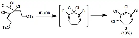 Po eliminacích ditosylátů nastávají přesmyky; vzniklé chlorované cykloheptadieny se tak izomerizují na konjugované heptadieny 3.[10]