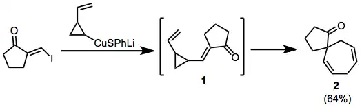 V níže uvedeném případě se adicí-eliminací za přítomnosti sloučeniny mědi vytvoří enon 1, jenž se přesmykuje na spirocyklický meziprodukt 2;