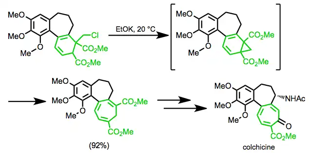 Při Eschenmoserově syntéze kolchicinu byl přesmyk tohoto druhu použit k vytvoření sedmičlenného kruhu cílové molekuly.[19]