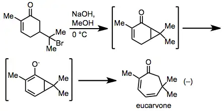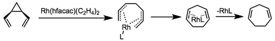 První přípravu cykloheptadienu přesmykem divinylcyklopropanu provedl Adolf von Baeyer během syntézy eukarvonu z karvonhydrobromidu.[17] Mechanistickými studiemi bylo zjištěno, že tato varianta přesmyku probíhá soustředěným mechanismem Copeova typu.[18]
