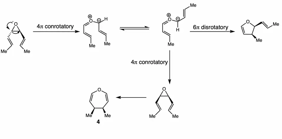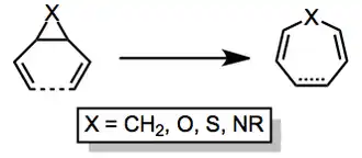 Do těchto reakcí je možné zapojit také substráty se tříčlennými heterocykly. cis-Divinylepoxidy za teplot kolem 100 °C poskytují oxepiny, u jejich trans-izomerů se také objevují přesmyky na dihydrofurany přes karbonylylidy;[13] tytéž ylidy byly také navrženy jako přímé prekurzory oxepinů 4.[14] Konjugované dienylepoxidy dávají vzniknout podobným produktům, což podporuje předpoklady o ylidových meziproduktech.[15]