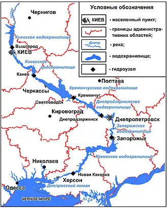 Na území Ukrajiny protéká řeka Dněpr v délce 980 km, z toho v přirozeném korytu pouze v délce 100 km. Celková plocha přehradních nádrží je 6 976 km². Narovnáním vodní cesty vybudováním umělých jezer se zkrátila celková délka řeky z přírodních 2 285 na 2 201 km. Většina přítoku pochází z plochy povodí horního Dněpru, úsek středního Dněpru (Kyjev – Záporoží) a dolního Dněpru (Záporoží – ústí) přijímá již málo větších přítoků. Průměrný průtok 1370 m³/s v Kyjevě se v ústí navýší pouze na hodnotu kolem 1600 m³/s. Kaskáda vodních děl pokrývá právě střední a dolní tok, kde lze určit průměrný průtok na hodnotě 1500 m³/s. Spád od hladiny nejvyšší (Kyjevské nádrže) po hladinu řeky pod posledním stupněm (Kachovská elektrárna) je 102 m. Maximální teoretická roční výroba je tak 13,5 miliardy kWh. Tuto hodnotu je třeba snížit zohledněním účinnosti a nezpracovatelných průtokových maxim.