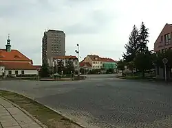 Mírové náměstí leží v centru města. Má výměru dva hektary. Na východním konci podlouhlého náměstí stojí radnice. V minulosti zde chtělo panstvo podle pověsti postavit kostel, záměr ale ztroskotal na odporu obyvatel, neboť se zde nacházel rybníček, a kachny a husy by se neměly kde koupat. Část náměstí zabírá autobusové stanoviště. V současnosti probíhají přípravy na rekonstrukci náměstí. Středem náměstí vede akátová alej se sochou sv. Šebestiána. Na severní straně náměstí zůstala z původní zástavby zachována budova sokolovny. Na západní straně navazuje jižně Komenského náměstí, na kterém stojí škola a pošta. Pražská ulice vede z náměstí až na konec města. K původní Pražské ulici byla po roce 1989 přiřazena i bývalá ulice Rudé armády. Na této ulici se nachází zámek, kostel Nejsvětější Trojice i železniční stanice. Po ulici je částečně vedena trasa silnice II/114. Náměstí svobody leží na Pražské ulici nad rybníkem Koryto. Nachází se zde zámek a kostel a v parčíku socha sv. Jana Nepomuckého.