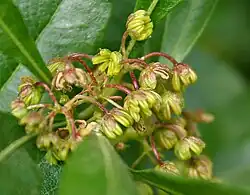 Rostlina obvykle mívá květy pouze samčí nebo pouze samičí, jen velmi zřídka má květy oboupohlavné. Květy jsou zelené až zelenavě žluté či narůžovělé a mají asi 1 cm dlouhé stopky. V počtu dvanácti až patnácti vytvářejí postranní nebo vrcholičnatá latnatá či hroznovitá květenství dlouhá asi 3 cm, kde visí na svěšených stopkách. Všechny květy mají tři až čtyři volné, vytrvalé, zelenožluté kališní lístky, které jsou eliptické či vejčité a jen do 3 mm dlouhé. Samčí květ má kališní lístky zelenavé a pět až sedm tyčinek s krátkými nitkami a podlouhlými 3 mm prašníky; mají rudimentální semeník. Samičí květ má eliptické, zelenavě žluté kališní lístky, dvou či třídílný horní semeník asi 1,5 mm velký a pestík s čnělkou nesoucí dvou nebo třílaločnou bliznu; tyčinky s prašníky zcela chybí nebo jsou nefunkční. Květy neprodukují nektar a pyl nutný pro opylení je přenášen větrem, na samčí květy však přilétají včely pro pyl. Nepřítomnost korunních lístků usnadňuje vystavení květů větru pro opylování.