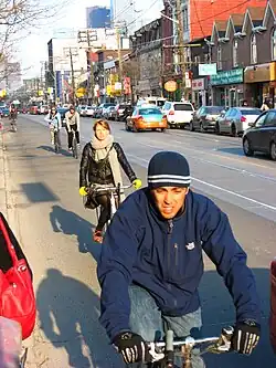 Příklad dopravní cyklistiky — pracující v Torontu jedou večer domů