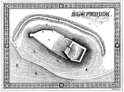1 – cesta, 2 – val, 3 – příkop, 4 – hradba, 5 – brána, 6 – dolní hrad, 7 – horní hrad