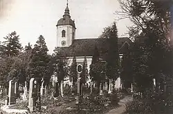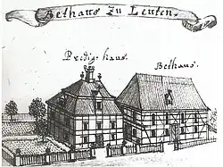 Kresba Friedricha Bernharda Wernera z roku 1734 publikovaná v Topografii Slezska. Jedná se o kostel v Dolní Lutyni, vlevo je fara