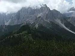| 3. den | Rifugio Bosi | Rifugio Vandelli | 6.00 h – 6.30 h | 890 m | 1170 m | Lehký sestup lesem do údolí Val Popena, po stěně Piz Popena opět nahoru na Forcella de Popena a přechod přes suťové svahy Pale di Misurina. Dolů do širokého průsmyku Passo Tre Croci a po hodně vyšlapané, poměrně snadné cestě, ale přesto místy zajištěné ocelovými lany a žebříky, bez velkých výškových rozdílů, k chatě Rifugio Vandelli z velké části lesem. |