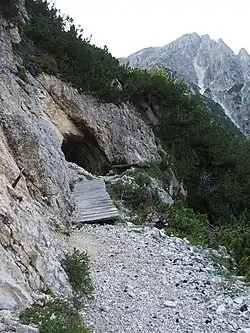 Vstup na via ferratu "Francesco Berti", která vede podél skupiny Sorapiss vysoko nad San Vito di Cadore