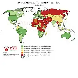 Oběťmi domácího násilí jsou všude po světě především ženy, které obvykle také zažívají jeho krutější podoby.[3][4] Ve srovnání s muži se ženy k páchání domácího násilí častěji uchylují v sebeobraně.[5] V některých částech světa bývá domácí násilí považováno za oprávněné nebo legální, a to obzvlášť v případech, kdy se žena dopustí nevěry nebo je z ní podezřívána. Výzkum prokázal, že existuje přímá a významná souvislost mezi mírou domácího násilí a rovností mezi muži a ženami ve společnosti. Čím je v zemi nižší úroveň rovnosti mezi těmito dvěma pohlavími, tím je míra domácího násilí vyšší.[6] Bez ohledu na pohlaví obětí je však domácí násilí jeden z nejméně často nahlašovaných trestných činů na světě.[7][8] V důsledku sociálních stigmat týkajících se mužské viktimizace existuje vyšší pravděpodobnost, že u nich budou poskytovatelé zdravotní péče znaky domácího násilí přehlížet.[9][10][11][12]