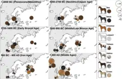 Kromě toho byli vědci schopni zmapovat změny v populaci v čase, jak se moderní domestikovaní koně rychle rozšiřovali po Eurasii a vytlačovali jiné místní populace, což se dělo přibližně od roku 2000 př. n. l. Genetický profil koní typu DOM2 je spojován s koňmi pohřbenými v sitaštských kurganech s ranými vozy s paprskovými koly a s koňmi ve střední Anatolii, kde byla zobrazována dvoukolová vozidla. Koně typu DOM2 se v některých oblastech vyskytují i před nejstaršími důkazy o vozech, což naznačuje, že jak jízda na koni, tak používání vozů byly faktory jejich expanze.[4]