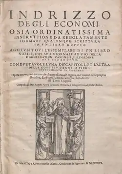 Celý název Pietriho díla zní: „Indirizzo degli Economi, o sia ordinatissima Instruttione da regolatamente formare qualunque Scrittura in un Libro doppio; aggiuntovi l’essemplare di un libro nobile, co’l suo giornale, ad uso della congregation cassinese, dell’ordine di S.Benedetto. Con due tavole, l’una de’ capitoli, et l’altra della cose piú degne, a pieno intendimento di ciascurno. Opera nuoua, non meno utile che necessaria, a Religiosi, che vivono delle proprie Rendite, & ad ogni Padre di Famiglia, che si diletti del Libro Doppio. Composta da Don Angelo Pietra Genovese Monaco, & indegno seruo di Giesu Christo.” Vydavatelem byl Francesco Osanna v Mantově. [2]