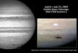 - ↑ a b c d Hubble Captures Rare Jupiter Collision [online]. Hubblesite (STScI-2009-23), 2009-07-24 [cit. 2009-07-24]. Dostupné online.