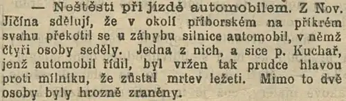 - ↑ GABZDYL, Josef. Před 120 lety se stala první tragická nehoda automobilu ve střední Evropě. iDNES.cz [online]. 2020-05-01 [cit. 2020-05-21]. Dostupné online.