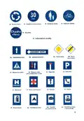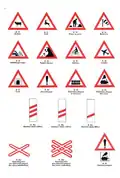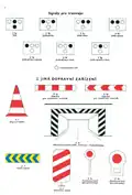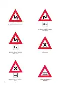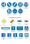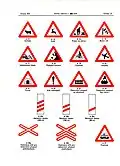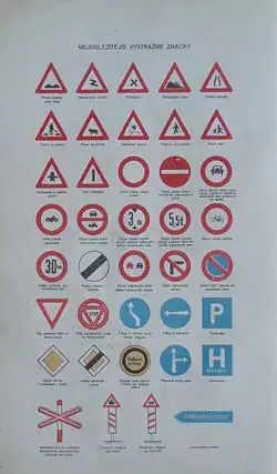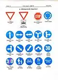 Nebezpečné klesání, Zúžená vozovka, Práce na silnici, Nebezpečí smyku, Přechod pro chodce, Pozor, děti!, Pozor, zvířata!, Pozor, zvěř!, Křižovatka se silnicí bez přednosti v jízdě, Zákaz odbočování vpravo, Zákaz odbočování vlevo, Zákaz předjíždění, Zákaz předjíždění pro nákladní automobily, Konec snížené (zvýšené) rychlosti, Nejnižší dovolená rychlost, Konec nejnižší dovolené rychlosti, Zákaz zvukových znamení, Konec zákazu zvukových znamení, Dej přednost v jízdě protijedoucím vozidlům!, Přednost v jízdě před protijedoucími vozidly, Jiný zákaz, Jiný příkaz. Zaveden nové značení pro přechod pro chodce: beliša maják pro označení přechodu, má přednost mezi chodcům.