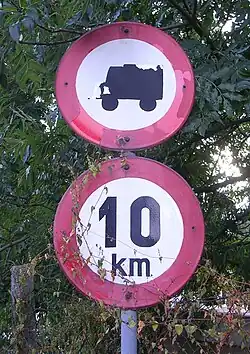 - zákazové, kruhovitého tvaru s červeným okrajem, bílým středem a černým nebo tmavomodrým symbolem uprostřed