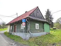 Informační panel 5 – Roubený dům „Dřevěnka“, který je historickou stavbou lidové architektury a v minulosti zde sídlila místní škola.