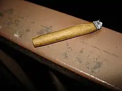 - obsahuje tabákovou náplň, krycí list v normální barvě doutníku z rekonstituovaného tabáku zakrývající celý tabákový výrobek včetně případného filtru, ale nezakrývajícího náustek v případě náustkových doutníků, jehož jednotková hmotnost činí bez filtru nebo náustku nejméně 2,3 g a venkovní obvod nejméně jedné třetiny délky tabákového smotku je nejméně 34 mm.