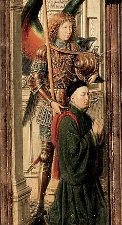 O rameno mladistvě vyhlížejícího svatého Michala je opřeno kopí.[33] Michael je oděn do složitě zdobené a barevné zbroje, levou rukou drží přílbu,[24] zatímco pravou ruku má položenou na rameni donátora, který ho představuje Marii. Donátor klečí v modlitbě před Pannou Marií a ruce má zdvižené vzhůru, jako by se modlil, ačkoli nejsou sepjaté. Na pravém malíčku má zlatý prsten a je oblečen do dlouhého olivově zeleného houppelandu,[4][21] který byl v té době vrcholem módy a ukazatelem postavení na burgundském dvoře.[11] Šaty mají kožešinou lemovaný vysoký límec a hluboké pytlovité rukávy, rovněž lemované kožešinou. Pro nizozemskou módu poloviny 30. let 14. století je typický i donátorův účes ve tvaru misky, zaoblený na okraji, ale zastřižený nad ušima. Až na červenou kapuci se oděv velmi podobá tomu, který měl na sobě ženich na Svatbě manželů Arnolfiniových.[34]