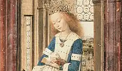 - ↑ Nápis na tomto panelu zní: »HEC EST SPECIOSIOR SOLE ET SUPER OMNEM DISPOSTITIONEM STELLARUM LUCI COMPARATA INVENITUR PRIOR. CANDOR EST ENIM LUCIS AETERNAE ET SPECULUM SINE MACULA DEI MAIESTATIS ECT. EGO QUASI VITIS FRUCTIVICAVI SUAVITATEM ODORIS ET FLORES MEI FRUCTIS HONORIS ET HONESTATIS. ECO MATER PULCHARAE DILECTIONIS ET TIMORIS ET MAGNITUDINES ET SANCTAE SPEI« („Je krásnější než slunce a nad celý řád hvězd. Když ji srovnáme s denním světlem, zjistíme, že vyniká. Je totiž jasem věčného světla a bezchybným zrcadlem Božího majestátu. Jako vinná réva jsem vydala příjemnou vůni a mé květy jsou plodem cti a počestnosti. Jsem matkou krásné lásky, bázně, velikosti a svaté naděje.“) viz Dhanens (1980), s. 385; Heath (2008), s. 110