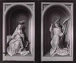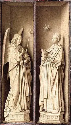 Po zavření triptychu se na vnějších křídlech objeví scéna Zvěstování s archandělem Gabrielem a Marií malovaná en grisaille. Postavy tvoří iluzi sochy, kterou van Eyck ještě umocnil jejich umístěním na osmiboké podstavce.[6] Postavy jsou nasvíceny světlem zleva, což van Eyck často používal k naznačení Boží přítomnosti. Nad Marií se vznáší holubice představující Ducha svatého. Protože holubice je rovněž provedena en grisaille, ale není připevněna k podstavci a zřejmě se vznáší neupevněná nad světci, slouží její přítomnost ke zdůraznění toho, že se divák nedívá na sochu, ale na malované zobrazení sochy.[37]