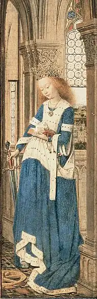 Na pravém panelu je svatá Kateřina představena téměř jako esence gotické princezny. Stojí a čte knihu v „úchvatné skromnosti“,[3] s rozpuštěnými světlými vlasy, které jsou zakončeny propracovanou korunkou s drahokamy, velmi podobnou té na Madoně kancléře Rolina, v kombinaci se sytě modrým šatem a tabardem z bílého přehozu z erminu, který ji ukazuje jako princeznu, jíž byla. Na krku jí visí zlatý řetěz s drahocenným přívěskem. Atributy s ní spojené jsou součástí jejího vyobrazení. V pravé ruce drží meč, jímž byla sťata, a u nohou jí leží lamací kolo, na němž byla mučena.[30] Stejně jako žena na van Eyckově Svatbě manželů Arnolfiniových je „módně hruškovitého tvaru“; Heath popisuje její oděv jako „oslnivější než oděv Panny Marie“, což odráží skvostnou zbroj svatého Michaela na protějším panelu.[31]