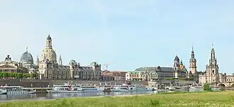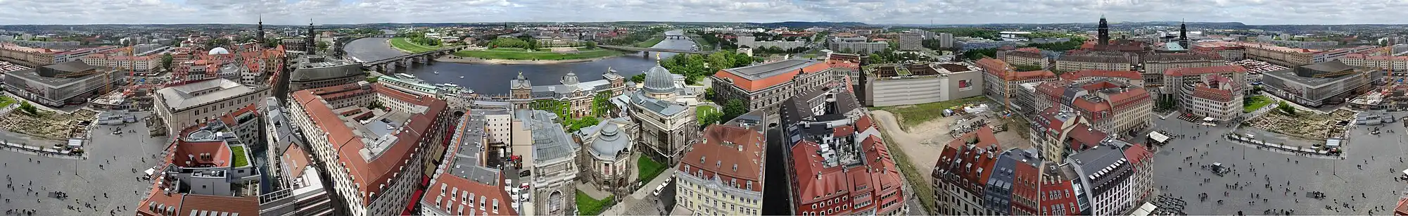 ![]() ![]() ![]() ![]() ![]() ![]() Ve směru hodinových ručiček: Drážďanské panorama s řekou Labe, Semperova opera, katedrála Nejsvětější Trojice, Vysoká škola výtvarných umění s kopulí zvanou „lis na citrony“ a sochou Fámy, Drážďany za soumraku, Rezidenční zámek, zrekonstruované domy na Neumarktu se sochou Fridricha Augusta II. Saského, kostel Frauenkirche za soumraku | |
