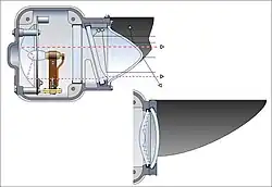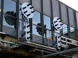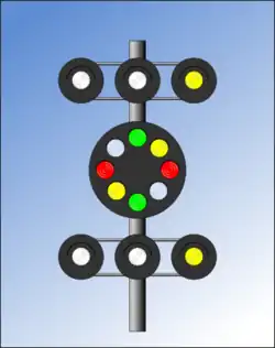 umístěná na lávce, horní skupina světel na kruhovém pozadí, dolní skupina světel na oříznutém pozadí