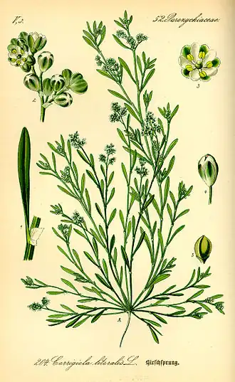 - ↑ THIERET, John W.; RABELER, Richard K. Flora of North America: Corrigiola littoralis [online]. Missouri Botanical Garden, St. Louis, MO & Harvard University Herbaria, Cambridge, MA, USA [cit. 2016-10-24]. Dostupné online. (anglicky)