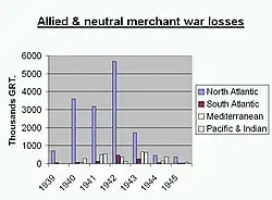 Bitva o Atlantik začala 3. září 1939, kdy německá ponorka U-30 potopila britský parník SS Athenia. Postupně německé ponorky začaly operovat dále od Anglie, v severním Atlantiku a s podporou dálkových letounů Focke-Wulf Fw 200 Condor. Zlaté období německých ponorek začalo po vstupu USA do války v prosinci 1941, kdy potopily mnoho lodí u východního pobřeží Spojených států a v Karibském moři. Jedna ponorka dokonce ostřelovala ústí řeky Mississippi. Z této oblasti se německé ponorky stáhly zhruba v červnu 1942, ale poslední loď byla u New Yorku německou ponorkou potopena 8. května 1945.