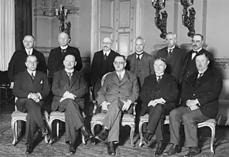 ![]() Zleva stojící: Dietrich, Hilferding, Curtius, Severing, von Guérard, Schätzel; zleva sedící: Koch-Weser, Müller, Groener, Wissell | |