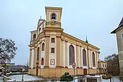 Kostel Nalezení svatého Kříže byl postaven v letech 1744–1760 nákladem hraběte Františka Karla Sweert-Sporcka pravděpodobně architektem Anselmem Luragem. Barokní báně věží shořely při požáru v roce 1845 a věže byly následně zastřešeny jen nízkými stříškami. Kostel byl poškozen i při bombardování v roce 1945. Zařízení je rokokové od Fr. Adámka a J. Chládka, hlavní oltářní obraz je signován „FB 1755“, obraz Nanebevzetí Panny Marie od F. J. Richtera z roku 1729 pochází ze zrušeného kostela, původně zasvěceného sv. Kateřině, posléze Nanebevzetí Panny Marie. Hřbitov kolem kostela byl zrušen v roce 1855, sochy sv. Václava a sv. Ludmily, které stály na schodišti u bočního vchodu kostela, byly v nedávné době zcizeny. U kostela stojí socha sv. Jana Nepomuckého z roku 1740, přenesená sem od farní zdi. Nedaleko kostela je farní budova z roku 1736.[8]