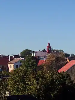 ![]() Centrální část města s památkově chráněnými budovami pošty, katolického kostela a českobratrské modlitebny | |