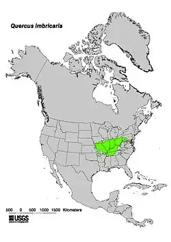 - ↑ a b c Flora of North America: Quercus imbricaria [online]. Dostupné online.