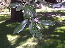 Podle podmínek může nabývat charakteru keře nebo rozložitého stromu. Ve stromové formě dorůstá přes 20 m do výšky, s rozpětím větví až 27 metrů; spodní větve se často sklánějí až k zemi a pak se opět stáčejí nahoru. Borka je tmavá, tlustá, podélně rozpraskaná. Řapíkaté, střídavě vyrůstající listy jsou podlouhle vejčité až kopinaté, celokrajné, tuhé a kožovité, na svrchní straně leskle tmavě zelené, na spodní našedlé, mírně plstnaté; dlouhé jsou 3,5–9, široké 2–4 cm. Vytrvávají jeden rok, opadávají na jaře těsně rozvinutím nových, dub tak působí dojmem stálezelené dřeviny. Kořenový systém sahá do velké hloubky, v mládí je kůlovitý, později se velmi široce rozvětvuje. Spolu s nízko položeným těžištěm vzhledem k široké, nízké koruně na krátkém kmeni tak strom dobře chrání proti silným větrům, včetně hurikánů.