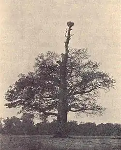 Starý dub, který na vrcholu kmene nesl čapí hnízdo.[3]