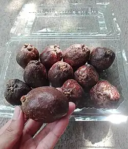 Plod je jednosemenná peckovice proměnlivého tvaru a velikostí, bývá stopkatý či přisedlý, ve zralosti je červený až oranžový a podlouhle vejčitý či nepravidelně hruškovitý. Je průměrně dlouhý 5 až 8 cm a široký 4 až 6 cm, dozrává asi za osm měsíců po opylení. Plod na stromě dlouho přetrvává, někdy až do doby dalšího kvetení. Ve zralostí je jeho oplodí tvrdé, dřevité a mezokarp (dužina) pod ním vláknitý. Vlastní semeno s dutým středem má tvar plodu, bývá 3,5 cm dlouhé, 3 cm široké a obsahuje poživatelný, slonově bílý endosperm chutnající po perníku. Endosperm nezralých semen je měkký a v dutině má oblíbenou tekutinu. Dospělý strom vyprodukuje průměrně 1000 až 2000 plodů, což je asi 50 kg. Čerstvý zralý plod váží asi 120 gramů, suchý pouze okolo 60. Ojediněle se vyskytují i stromy oboupohlavné, jejich plody jsou však menší a semena neklíčí. Dozrávající plody požírají paviání i sloni a semena roznášejí po okolí.[2][3][4][5]
