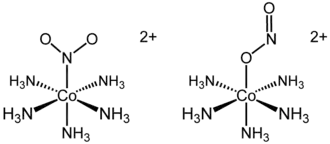 Izomerizace [(NH3)5Co-ONO]2+ na [(NH3)5Co-NO2]2+ probíhá vnitromolekulárně.[5]