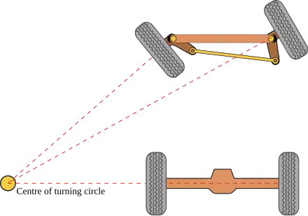 Díky Ackermannově geometrii řízení[5] se dá u vozů se dvěma nápravami částečně eliminovat smýkání kol přední nápravy. Smýkání kol zadní nápravy je vyřešeno diferenciálem, který umožňuje rozdílný počet otáček vnějších a vnitřních kol. Problém nastává u dvojmontáže, kde se v obloucích o malém poloměru projevuje i rozdíl v dráze jedné a druhé pneumatiky samotné dvojmontáže. Patentovaná řešení (volnoběžky, diferenciály v dvojmontáži), která by umožnila nezávislé otáčení kol dvojmontáže existují, ale vzhledem k přínosu by byla realizace příliš nákladná.