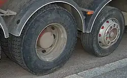 Slangově je dvojmontáž zadních kol označována výrazem „tupláky“. První použití je zaznamenáno u firmy Michelin.[1] Objevilo se i u závodních vozů.[2] Zdvojení kol nemá vliv na znak náprav, který nerozlišuje mezi jednoduchou a dvojitou montáží.