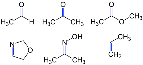 Dolní řada – 3-oxazolin, oxim acetonu (acetoxim) a propen