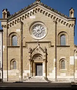 Budova kostela v novorománském slohu s kruhovými oblouky je dílem Lea von Klenze. Trojlodní bazilika má sedlovou střechu. Vstupní fasáda je zdobena růžicí, štít má akantové listy. Střešní římsa na střední lodi i na bočních lodích nese vždy dvě věžičky na přední a zadní straně.