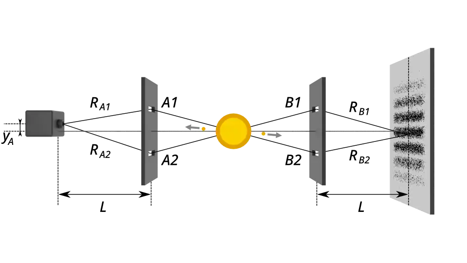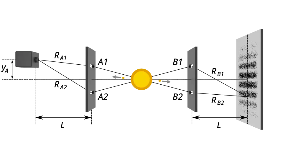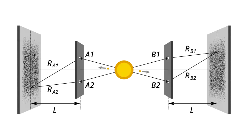 Přejděme nyní ke schématu dvou-dvouštěrbinového experimentu, tak jak je vyobrazeno na obrázku níže. Uprostřed se nachází zdroj fotonových párů a po obou stranách jsou nainstalovány dvouštěrbiny se stínítky. Zdroj vysílá fotony vždy ve dvojicích. To je podstatný rozdíl oproti předchozímu případu. Na první pohled by se mohlo zdát, že tento experiment není nic jiného než dva experimenty z předchozí kapitoly spojené dohromady. To není obecně pravda. Velkou roli nyní totiž hraje kvantový stav dvojice fotonů, které chápeme jako jeden celek a ne jako dva samostatné fotony. Stav těchto dvou fotonů totiž nemusí jít rozdělit do stavu fotonu prvního a stavu fotonu druhého. V takovém případě hovoříme o fotonech, které jsou kvantově provázány. Naopak, pokud konkrétní kvantový stav fotonů lze rozdělit na dvě samostatné části, není dvou-dvouštěrbinový experiment skutečně nic jiného než dva samostatné dvouštěrbinové experimenty.