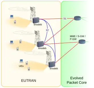 Síťová strana EUTRAN sestává pouze z eNodeBs. Úkoly ENodeB jsou podobné jako úkoly nodeBs spolu s řadičem rádiové sítě (RNC) v UTRAN. Účelem tohoto zjednodušení je omezit latenci všech operací na rádiovém rozhraní. eNodeBs jsou navzájem propojeny rozhraním X2, a k jádru sítě s přepojováním paketů (PS) se připojují rozhraním S1.[3]