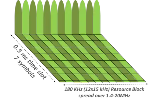 LTE komunikace se v časové doméně člení na rádiové rámce dlouhé 10 ms dále rozdělené na 10 podrámců po 1 ms. Pro jiné než Multimedia Broadcast Multicast Service (MBMS) podrámce je OFDMA odstup subnosných v frekvenční doméně 15 kHz. Dvanáct těchto subnosných přidělených současně během 0,5 ms časového intervalu se nazývá blok prostředků.[11] Pro LTE terminál mohou být přidělené minimálně 2 bloky prostředků během 1 podrámce (1 ms) pro downlink a uplink.[12]