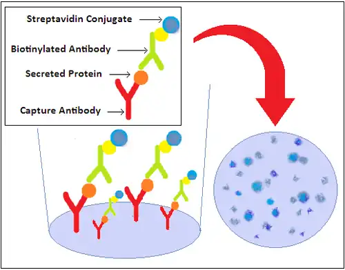 Cytokin je tedy "zachycen" v oblasti přímo obklopující sekreční buňku předtím, než má šanci difundovat do kultivačního média, nebo být degradován proteázami a vázán na receptory na okolních buňkách Po odstranění všech buněk a nenavázaných látek se do jamek přidá biotinylovaná polyklonální protilátka specifická pro zvolený analyt.