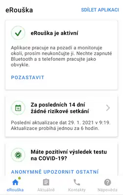 - ↑ NAVRÁTILOVÁ, Barbora. Aplikace eRouška, která varovala před rizikovými kontakty, končí. Podle ministerstva už není potřeba. iROZHLAS [online]. Český rozhlas, 2021-11-01. Dostupné online.