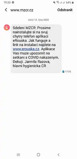 - ↑ HRON, Lukáš. Nainstalujte si aplikaci eRouška, vyzývají v SMS operátoři své zákazníky. iDNES.cz [online]. MAFRA, 2020-10-13 [cit. 2020-11-04]. Dostupné online.