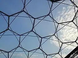 Venkovní biom (který není krytý) ukazuje mírné oblasti světa, s rostlinami jako je čajovník, levandule, chmel, konopí a slunečnice. Kryté biomy jsou vyrobeny z dutých profilů, ocelových trubek (hex-tri-hex). Většina šestihranných externích obkladových desek je vyrobena z termoplastu ETFE. Sklo nebylo možné použít, kvůli jeho váze a potenciálního rizika. Opláštění panelů bylo vytvořeno z několika vrstev tenké UV záření propustné ETFE fólie. Tyto fólie jsou utěsněny kolem obvodu a nafouknuté vytváří velký polštář. Výsledný polštář působí jako tepelná deka na strukturu. ETFE materiál je odolný vůči většině skvrn, které lze jednoduše smýt v dešti. I když je ETFE je náchylné k proražení, fólie mohou být snadno opraveny ETFE páskou. Struktura je zcela samonosná, bez vnitřních podpěr, a má podobu geodetické struktury. Panely se liší ve velikosti, dosahují až 9 m (29,5 stop) v průměru u největších v horní části konstrukce. ETFE technologie byla dodávána a instalována firmou Vector Foiltec, která je také zodpovědná za průběžné udržování pláště. Ocelový rám a obklady byly navrženy, dodány a instalovány MERO (UK) PLC, která také společně vyvinula celkovou geometrii schématu s architektem, Nicholasem Grimshawem & Partners. Celý stavební projekt byl řízen McAlpine Joint Venture.